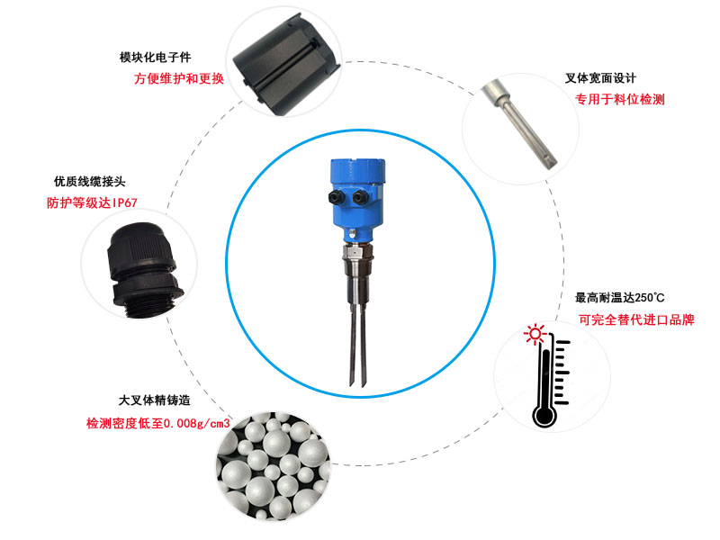 UVVF音叉料位開關利用機械共振原理,在激勵電路的作用下,壓電元件驅動叉體在諧振頻率處發生振動。當物料接觸叉體時,叉體的頻率和幅值急劇衰減,檢測電路檢測到這一衰減后輸出一個開關量信號。 |