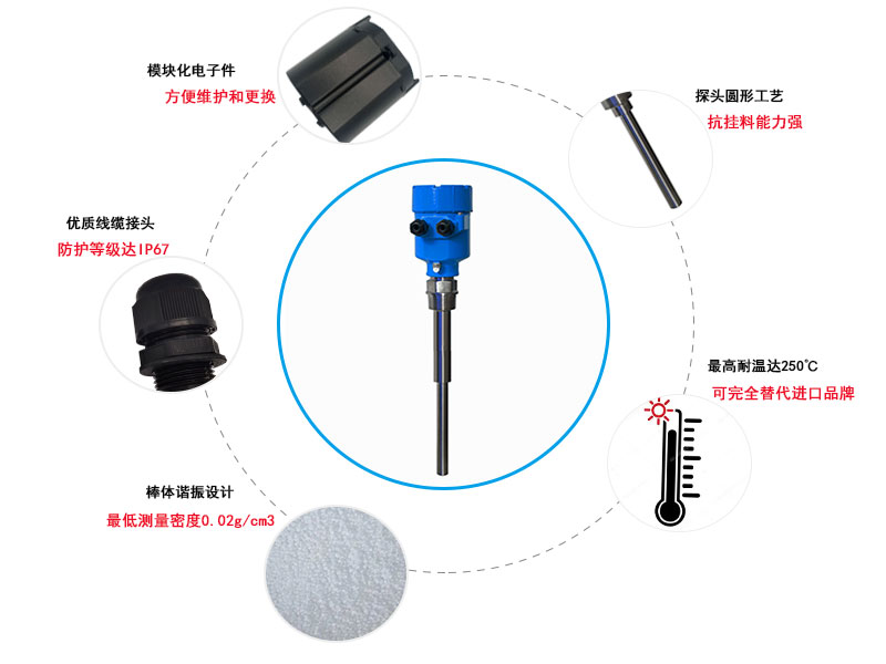 UVVR振棒料位開關利用機械共振原理,在激勵電路的作用下,壓電元件驅動振動棒在諧振頻率處發生振動。當物料接觸振動棒時,振動棒的頻率和幅值急劇衰減,檢測電路檢測到這一衰減后輸出一個開關量信號。 |
